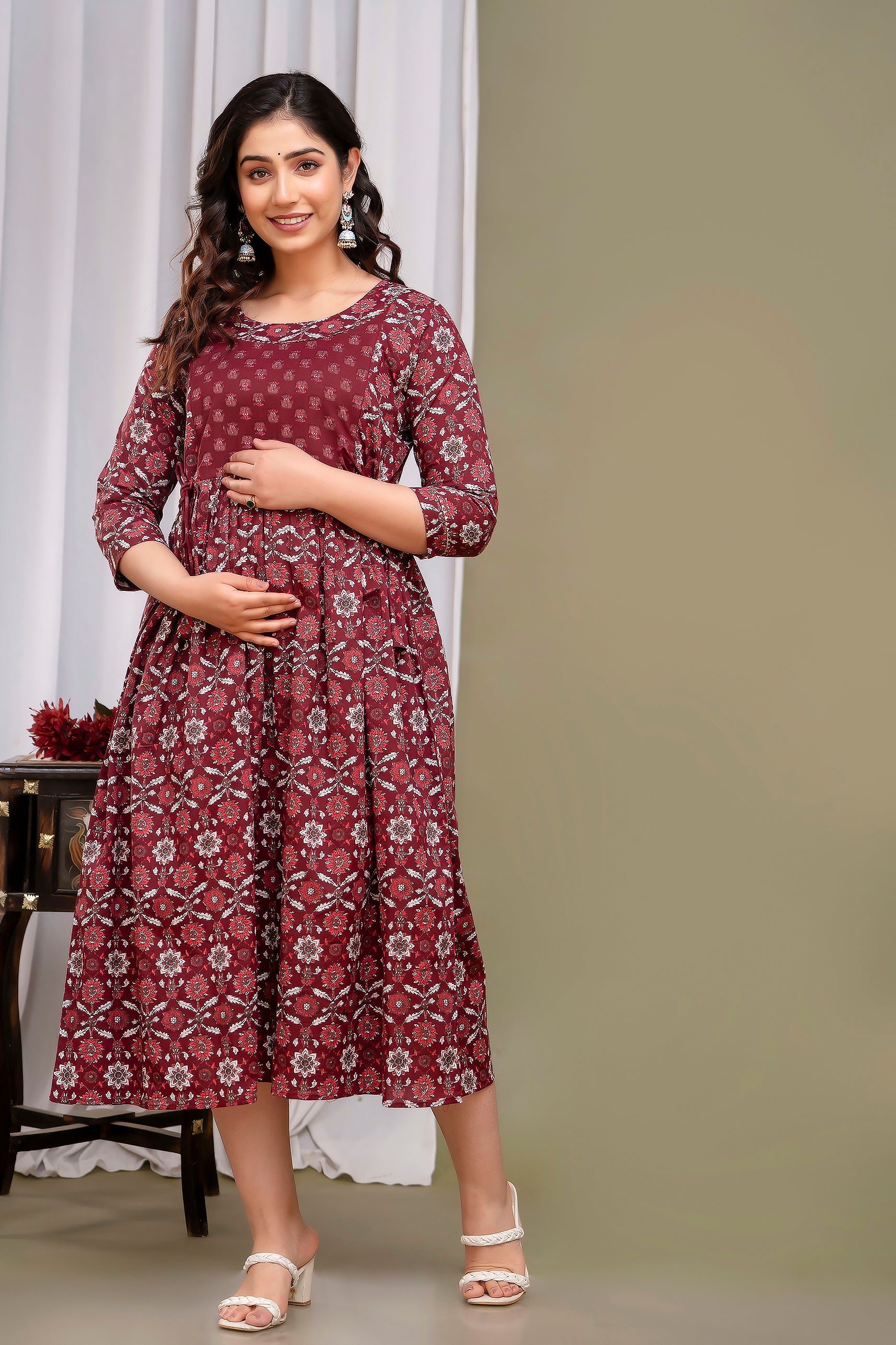 Women's Cotton Maternity and Nursing Anarkali Kurti provides comfort & convenience in pre- and post-pregnancy. Crafted from Cotton with a printed design, this piece features a discreet feeding zip. Stay comfortable through your motherhood journey with Nevisha Style Collection