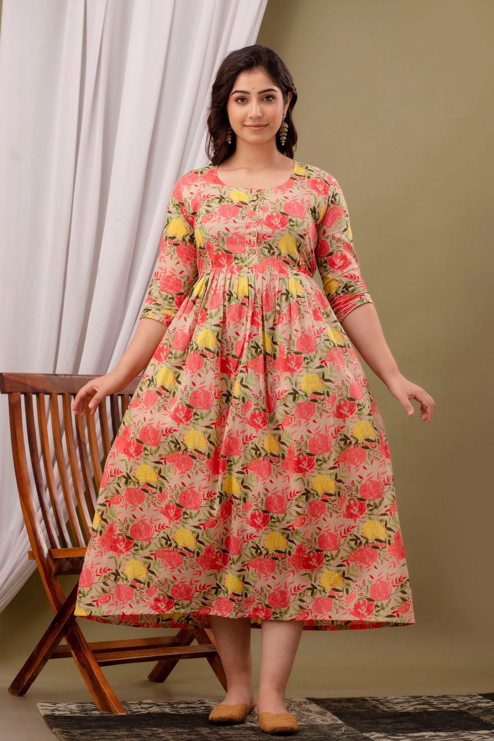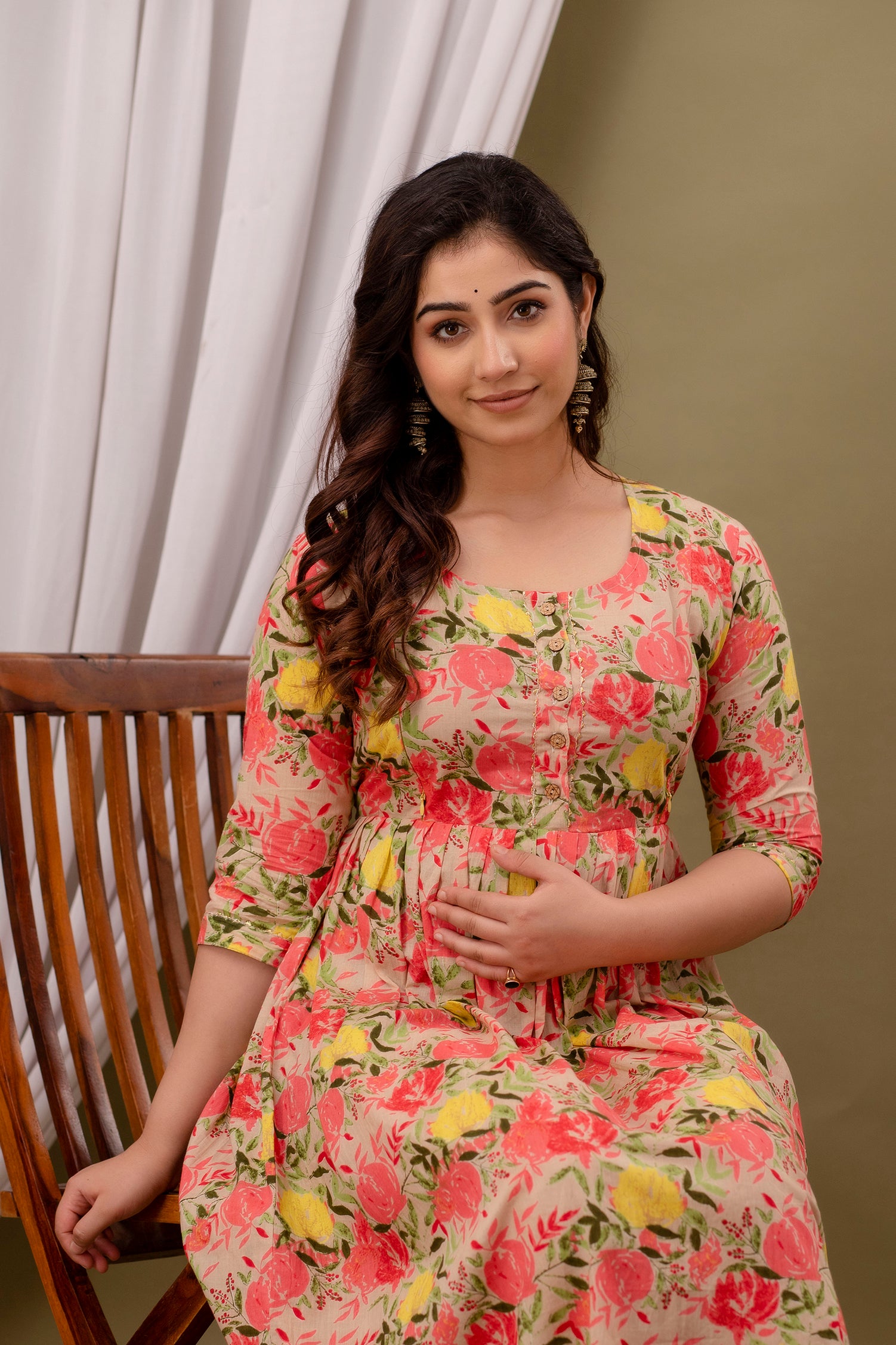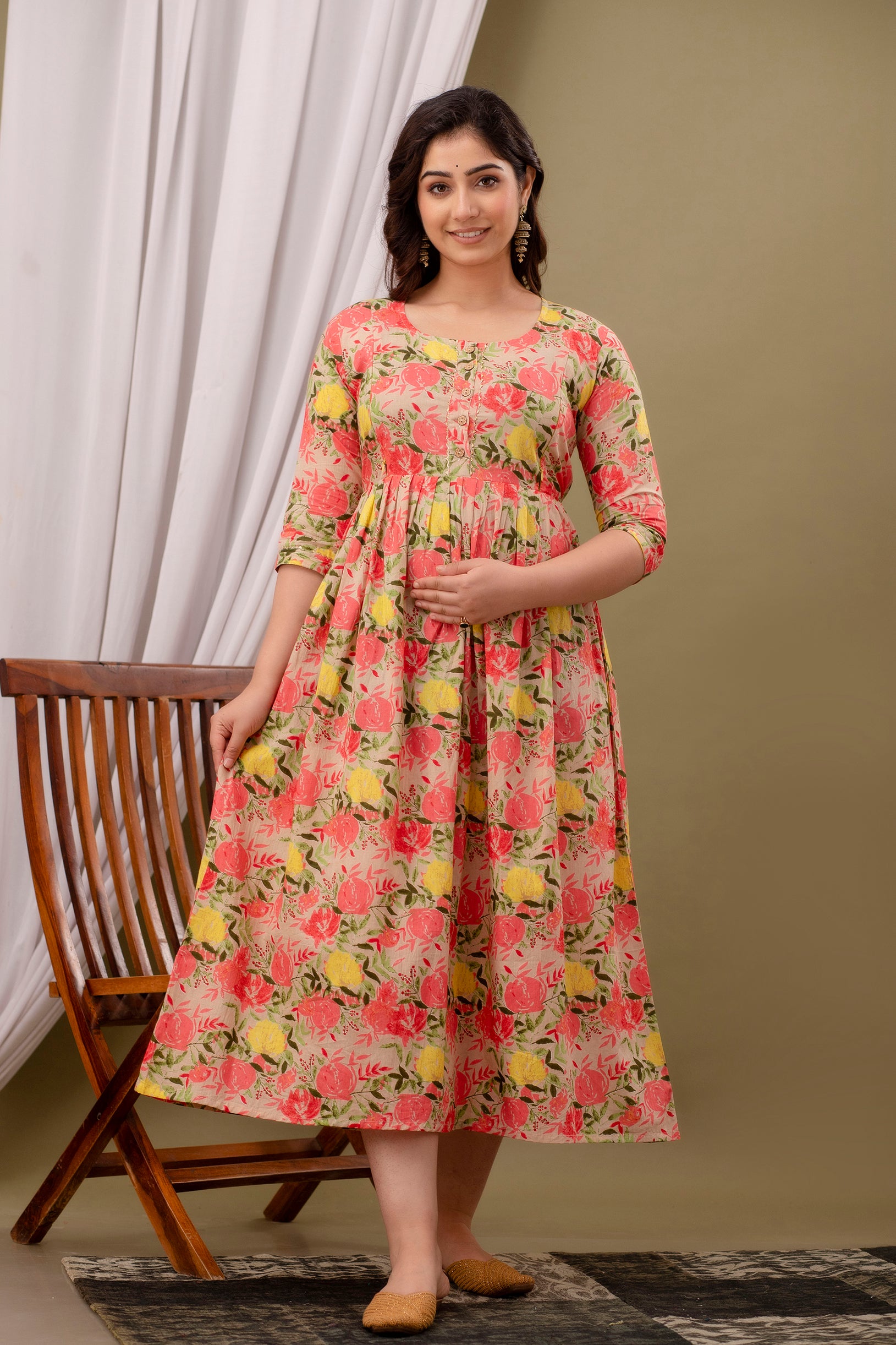 Women's Cotton Maternity and Feeding Anarkali Kurti, Useful for Pre-pregnancy and after pregnancy period, Cotton Printed maternity with feeding zip, Enjoy your maternity period with Nevisha Style Collection