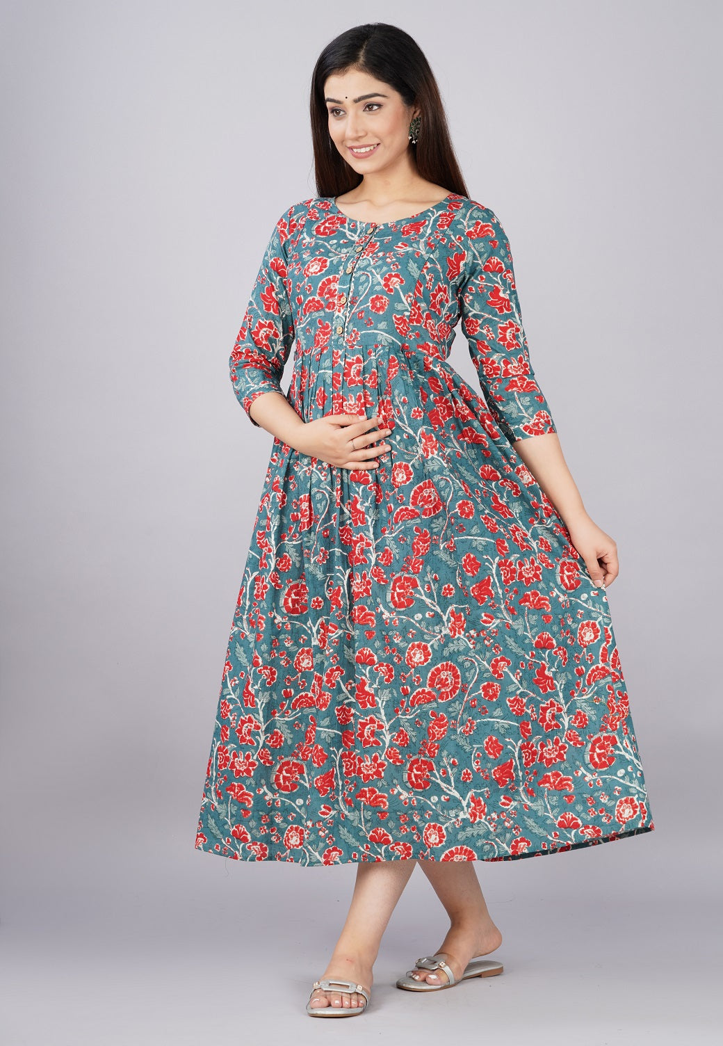 Women's Cotton Maternity and Nursing Anarkali Kurti provides comfort & convenience in pre- and post-pregnancy. Crafted from Cotton with a printed design, this piece features a discreet feeding zip. Stay comfortable through your motherhood journey with Nevisha Style Collection.