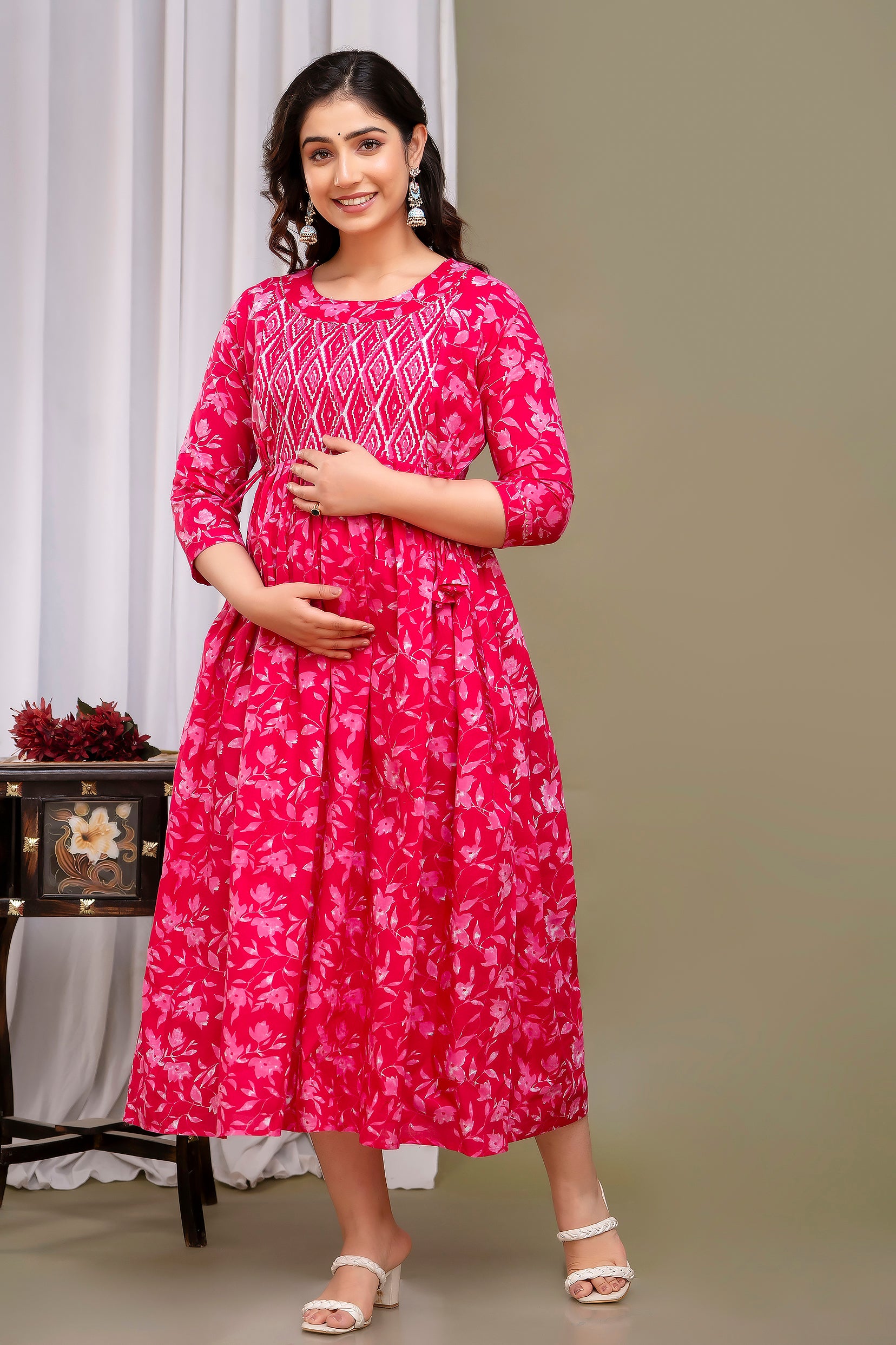 Women's Cotton Maternity and Nursing Anarkali Kurti provides comfort & convenience in pre- and post-pregnancy. Crafted from Cotton with a printed design, this piece features a discreet feeding zip. Stay comfortable through your motherhood journey with Nevisha Style Collection